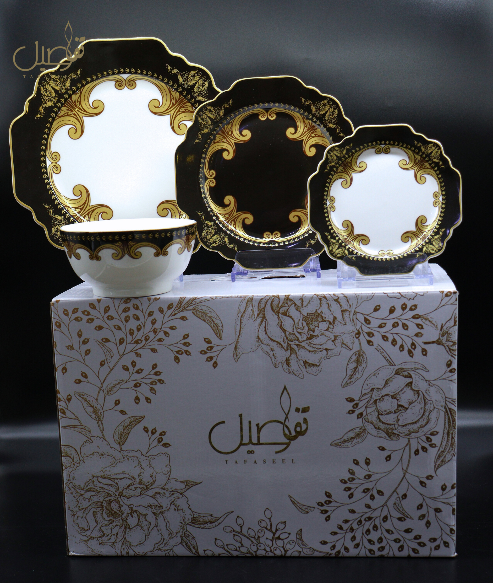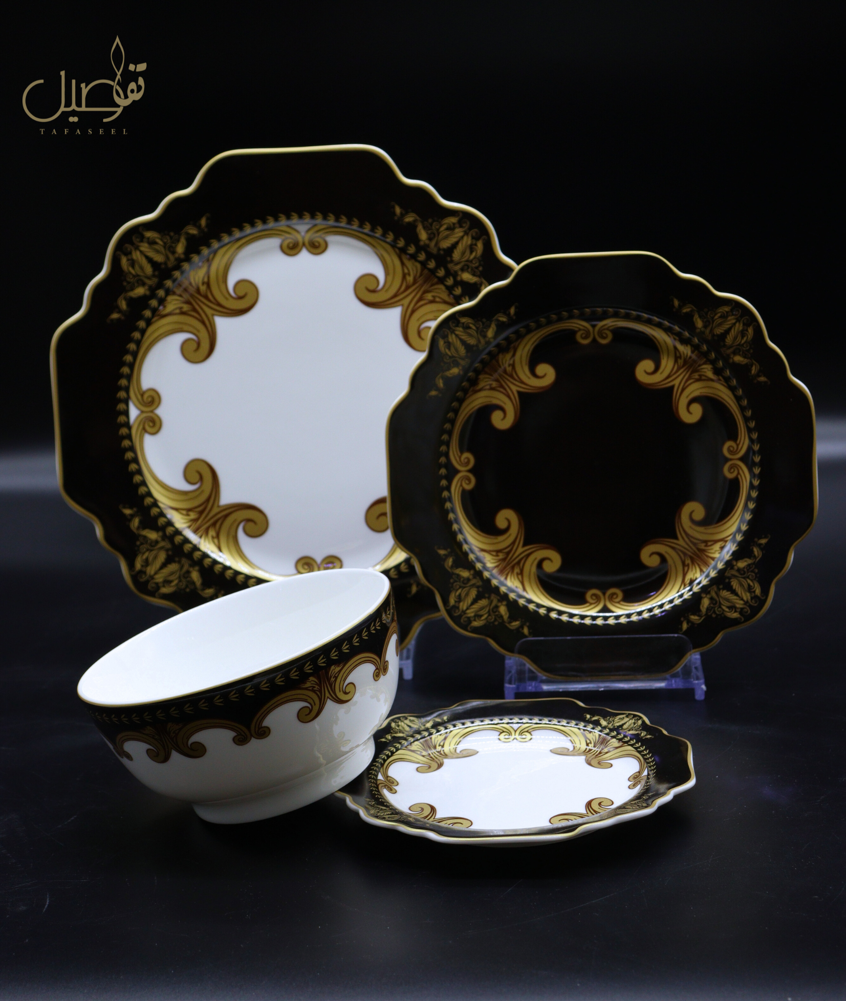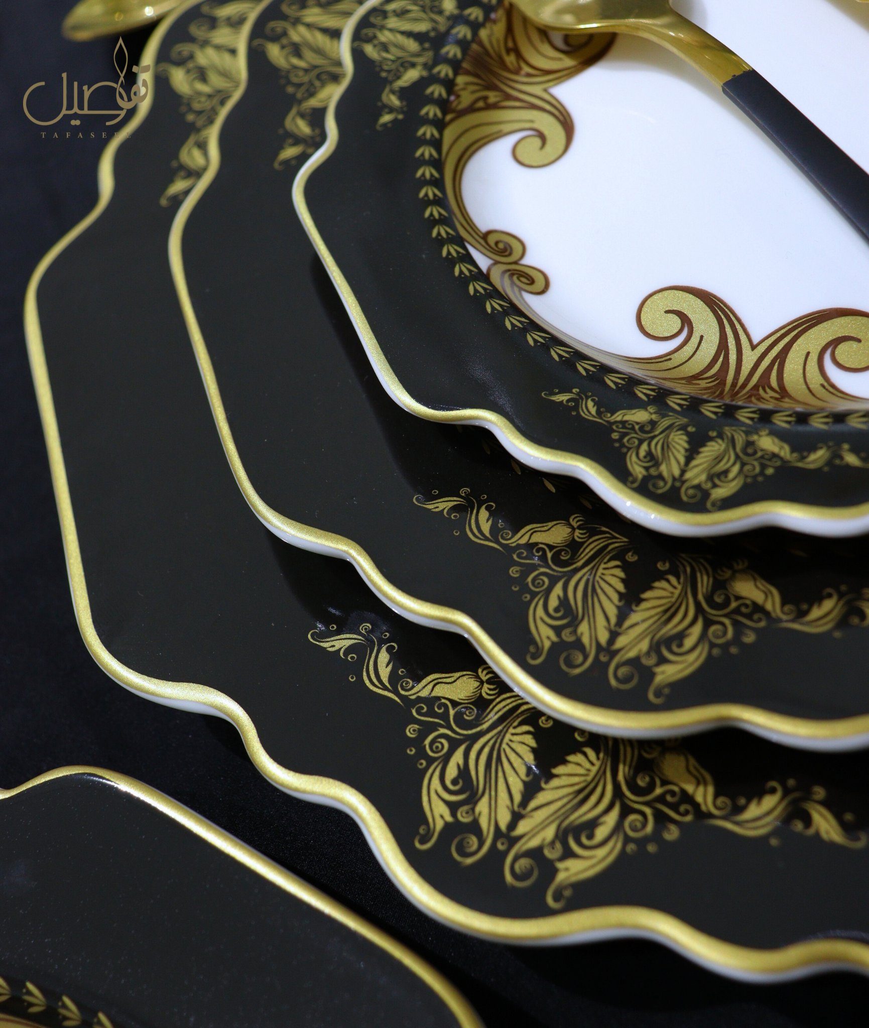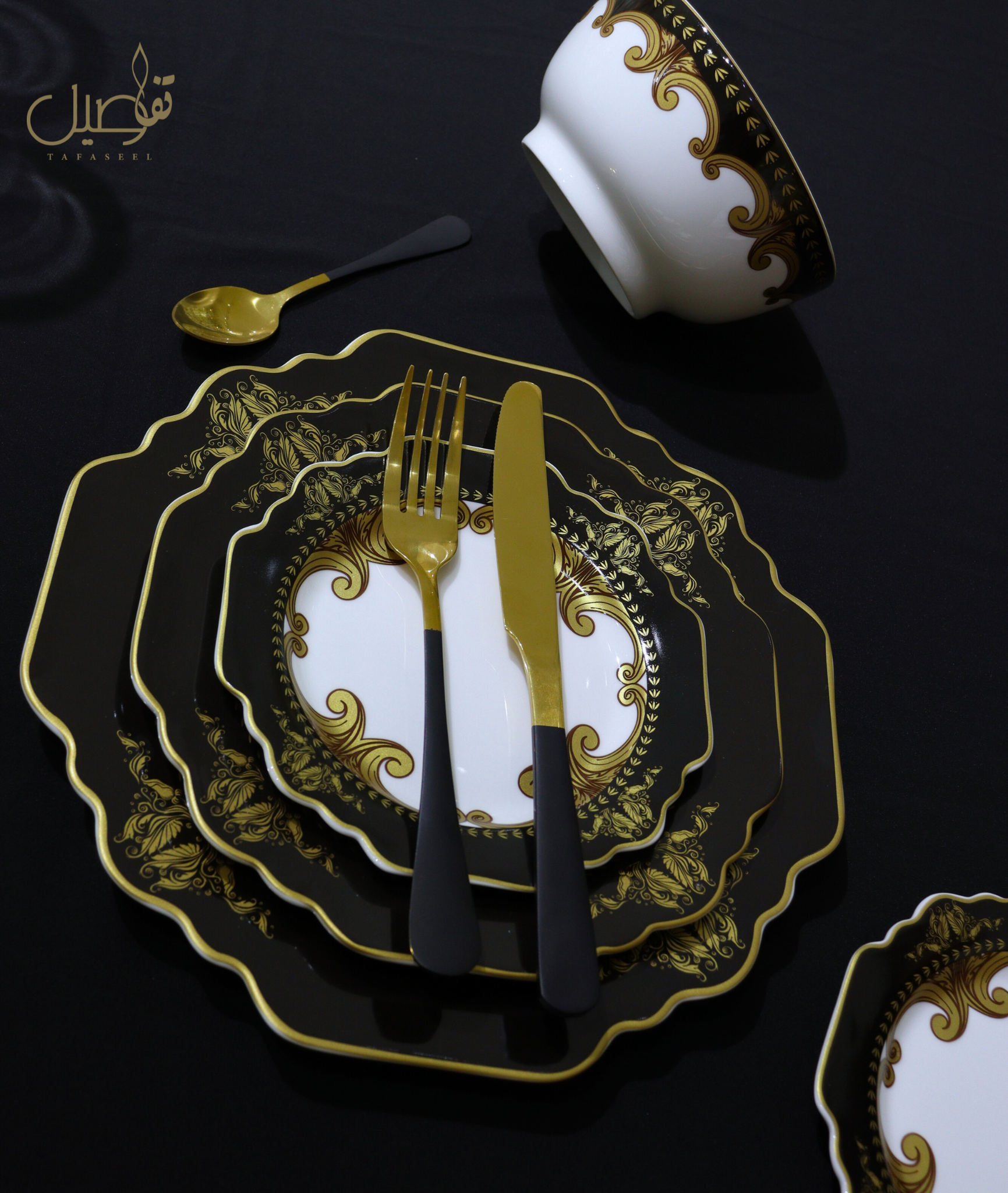 🌟 نقدم لك طقم الطعام الفاخر باللون الأسود الأنيق مع زينة ذهبية تضيف رونقًا ملكيًا.