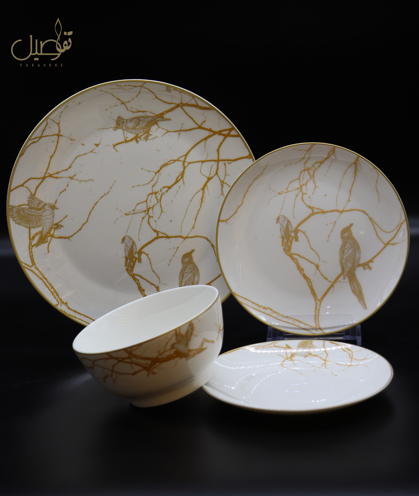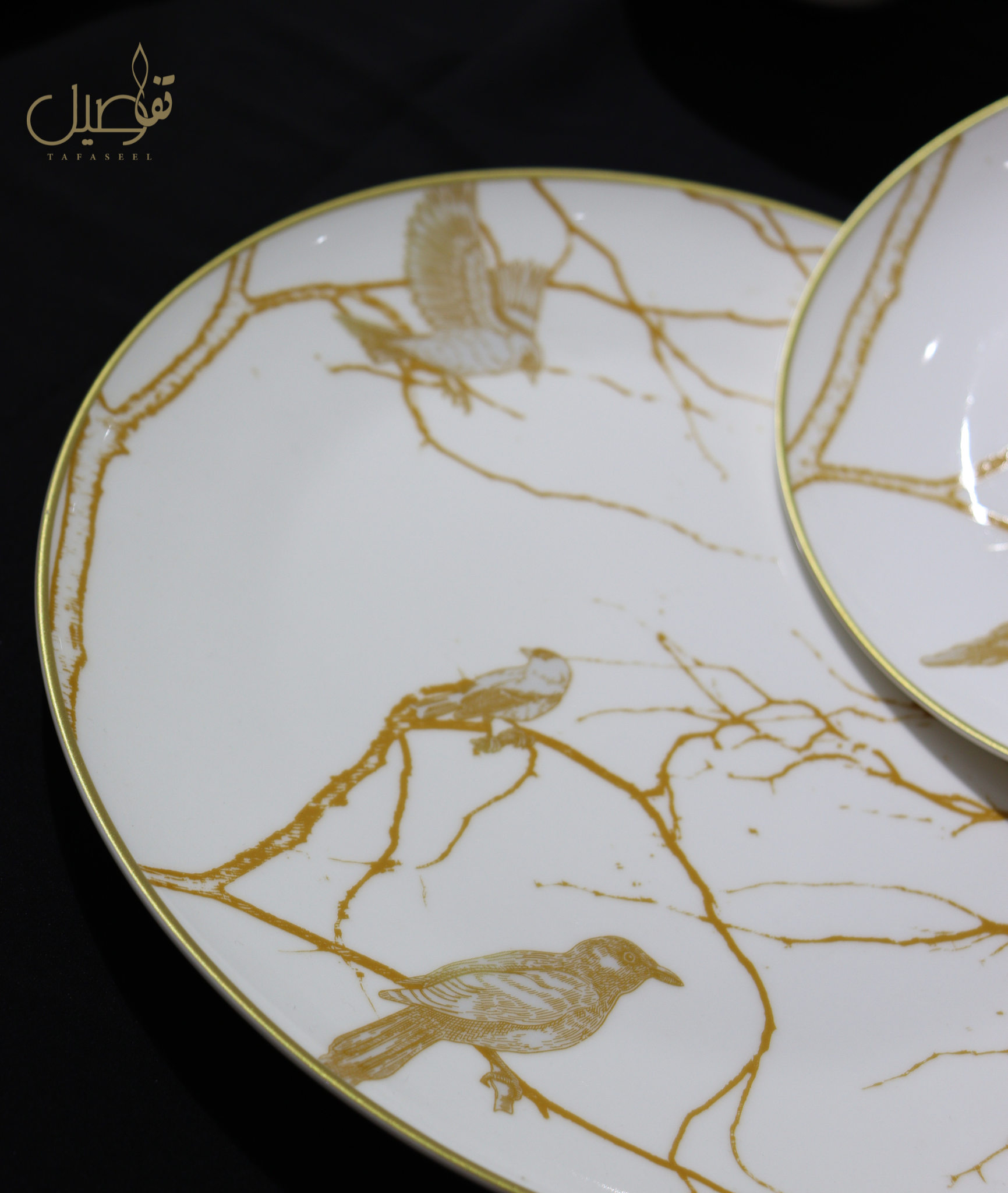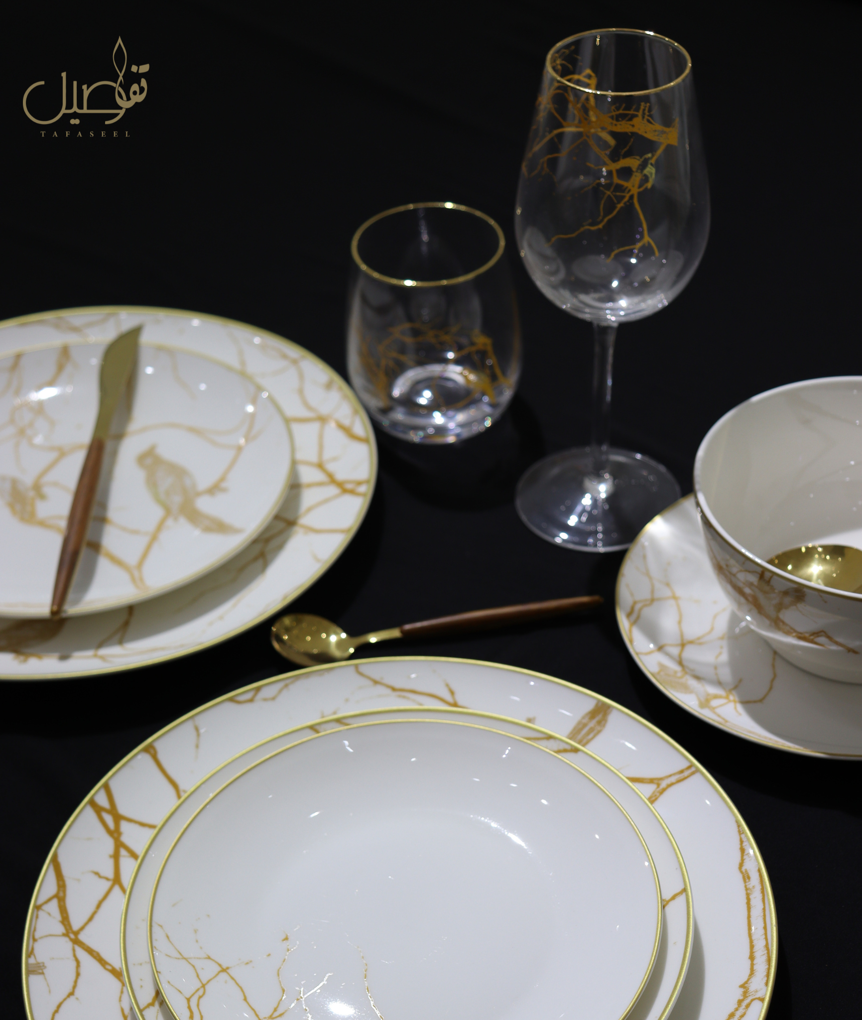 "طقم المائدة الأبيض بلمسة الطائر الذهبي - فخامة تجمع بين الأناقة والبساطة"