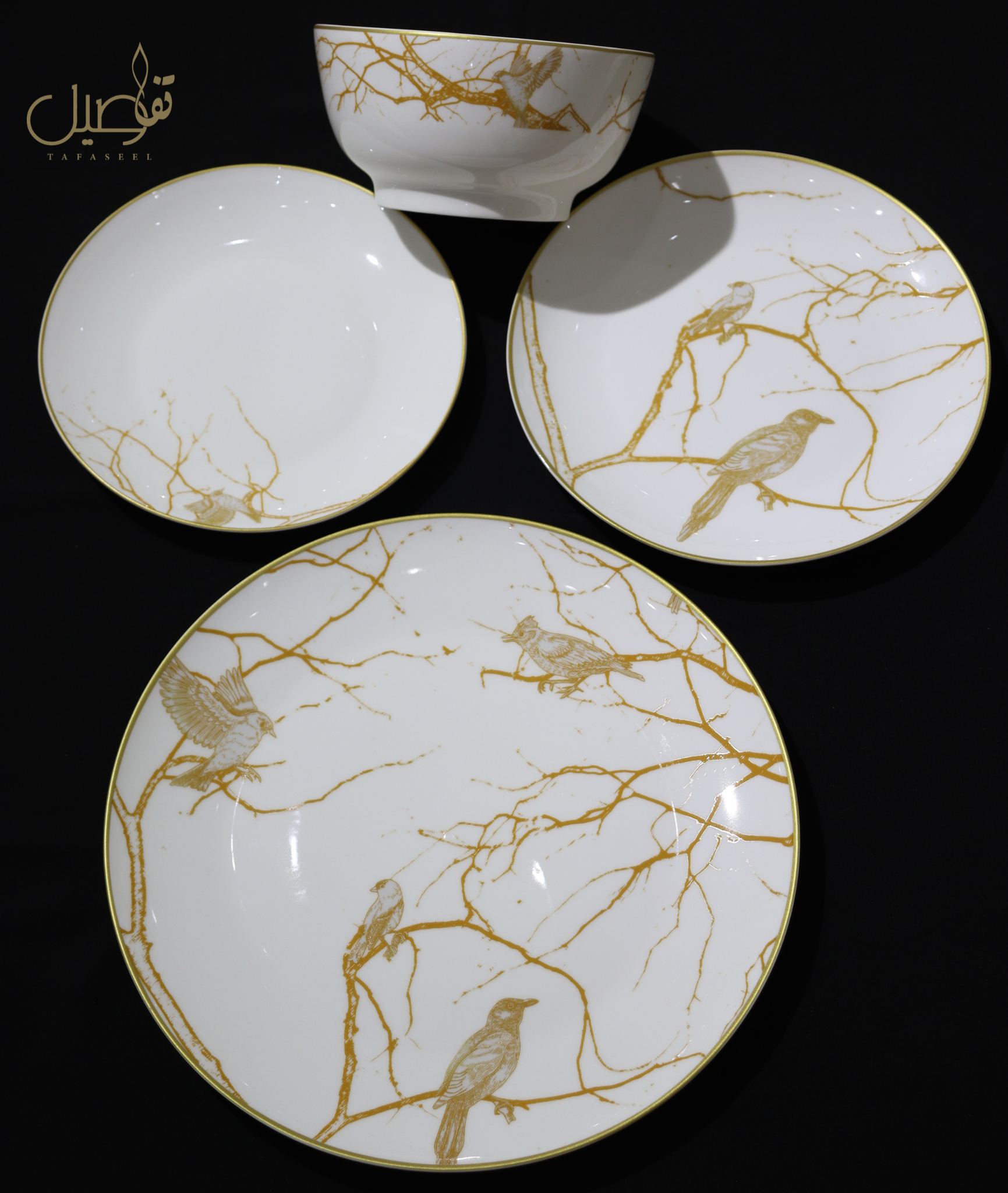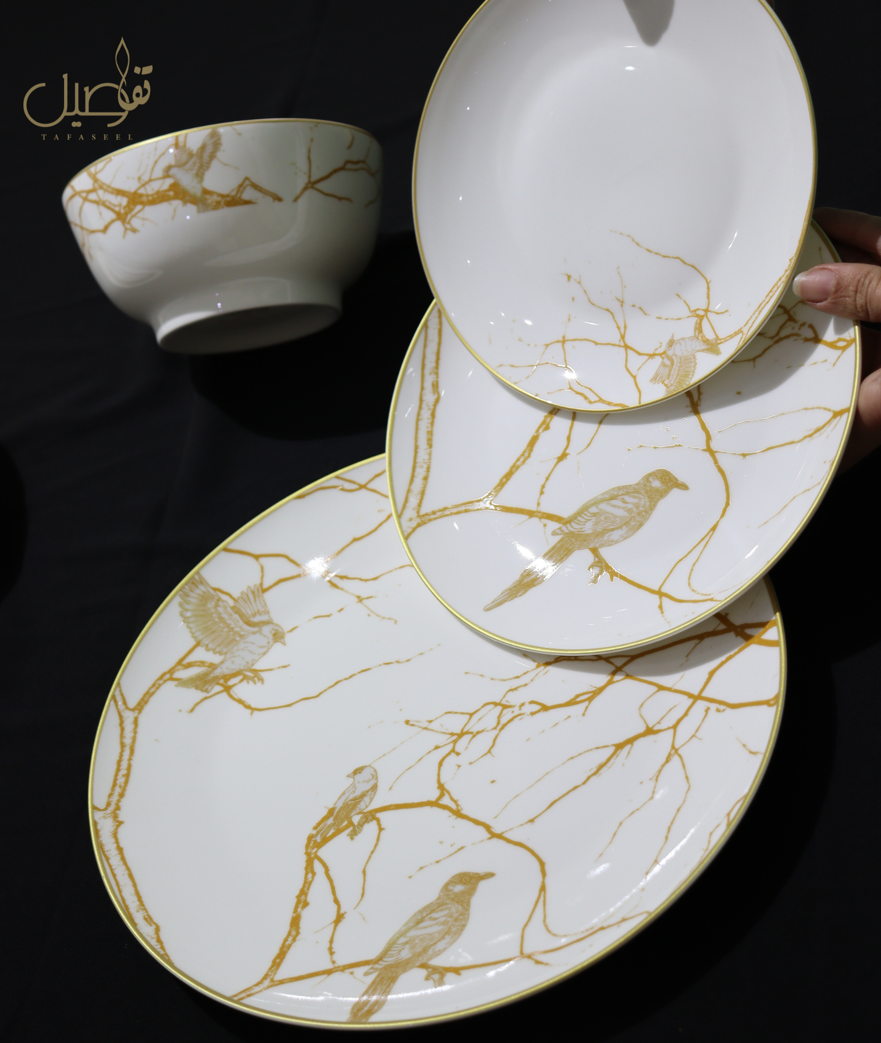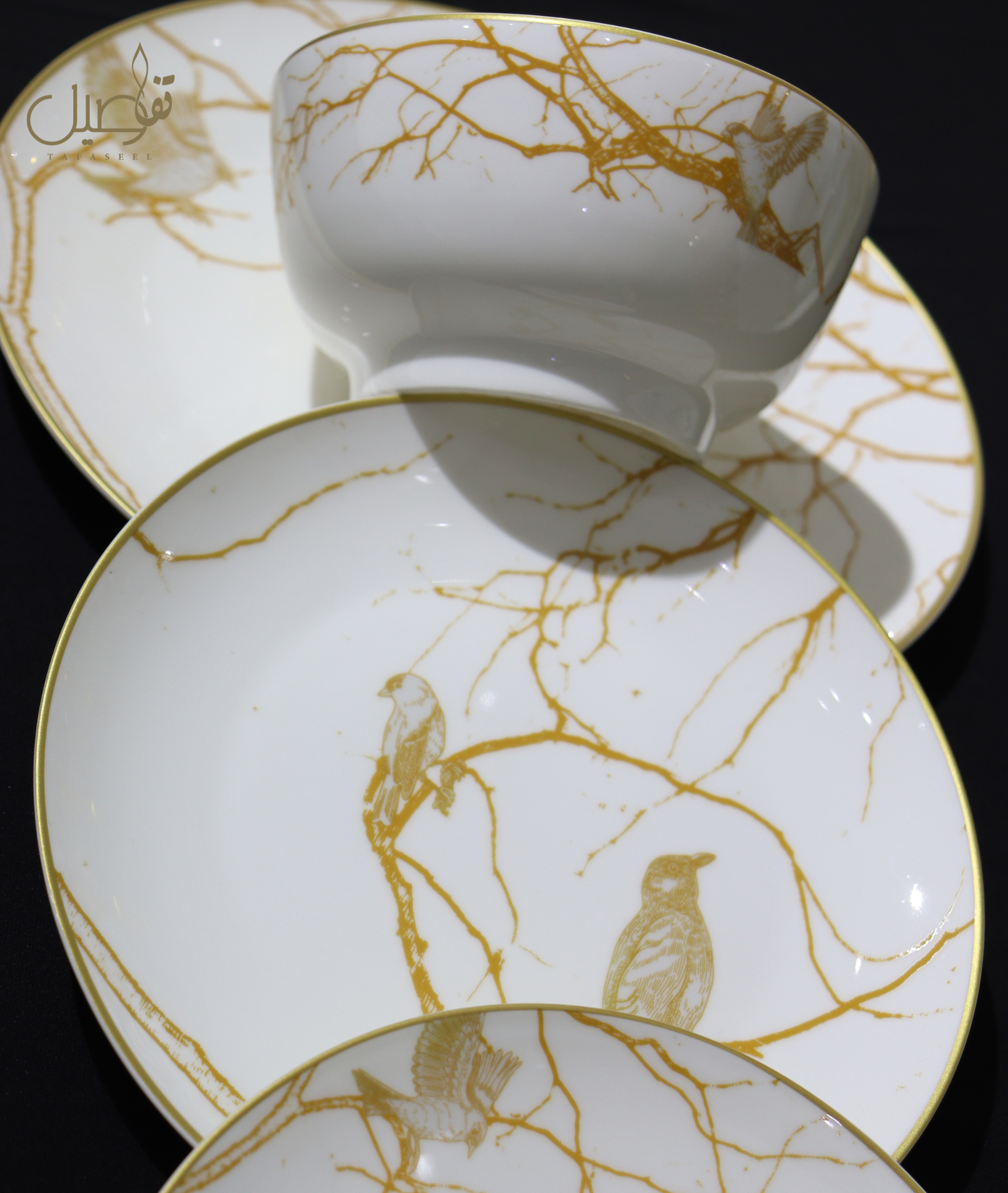 "طقم المائدة الأبيض بلمسة الطائر الذهبي - فخامة تجمع بين الأناقة والبساطة"