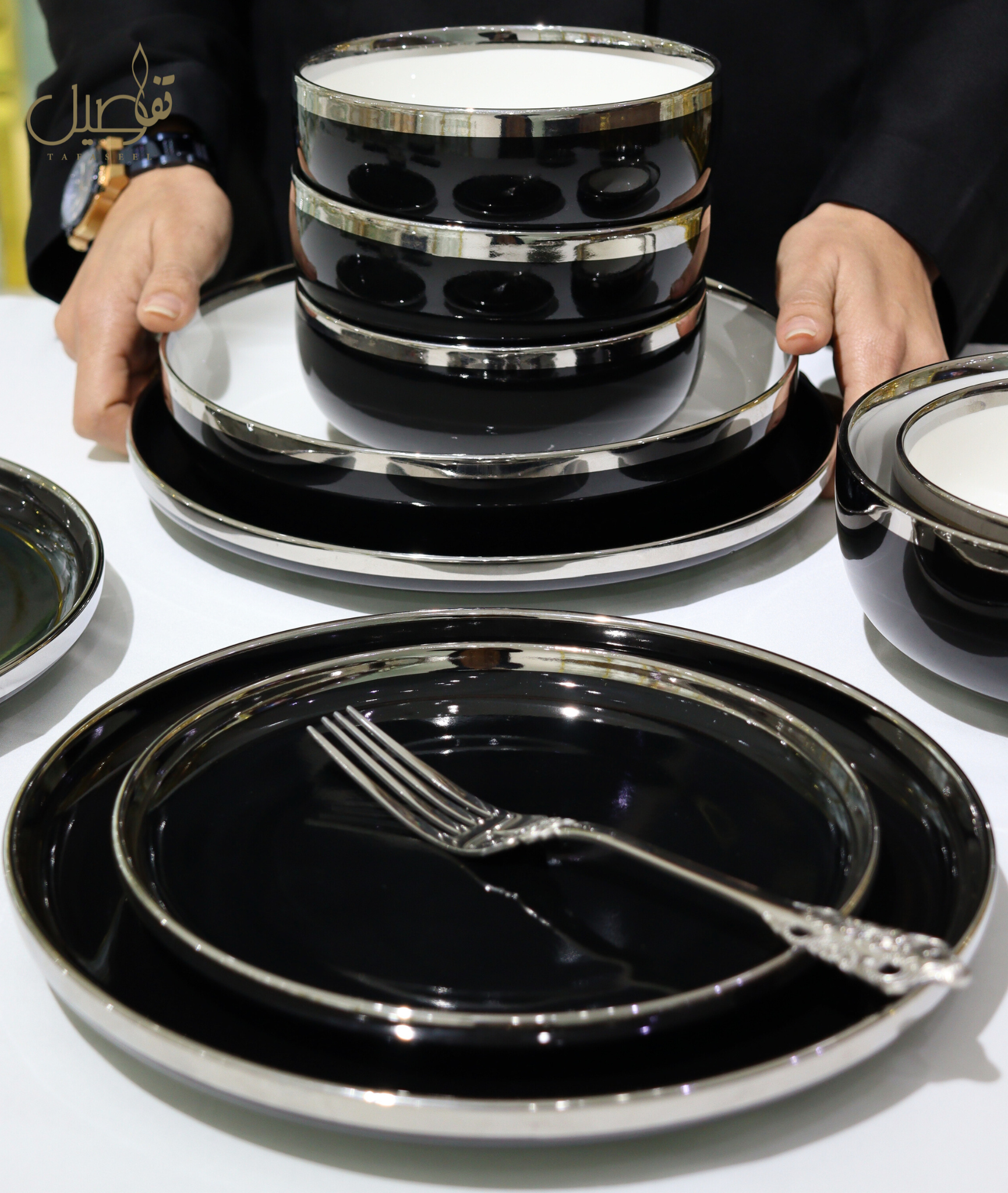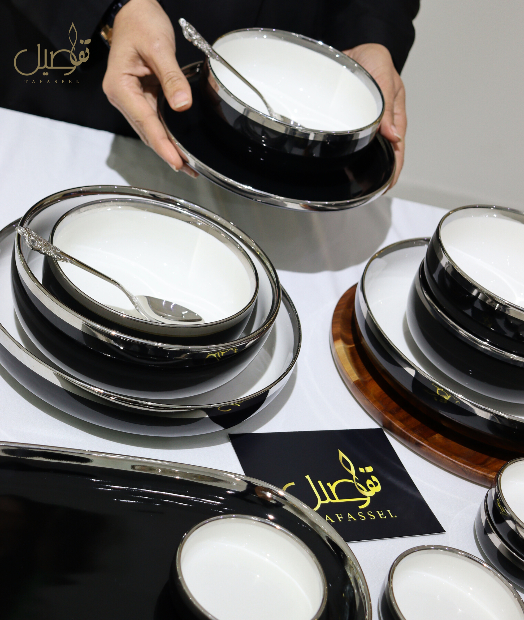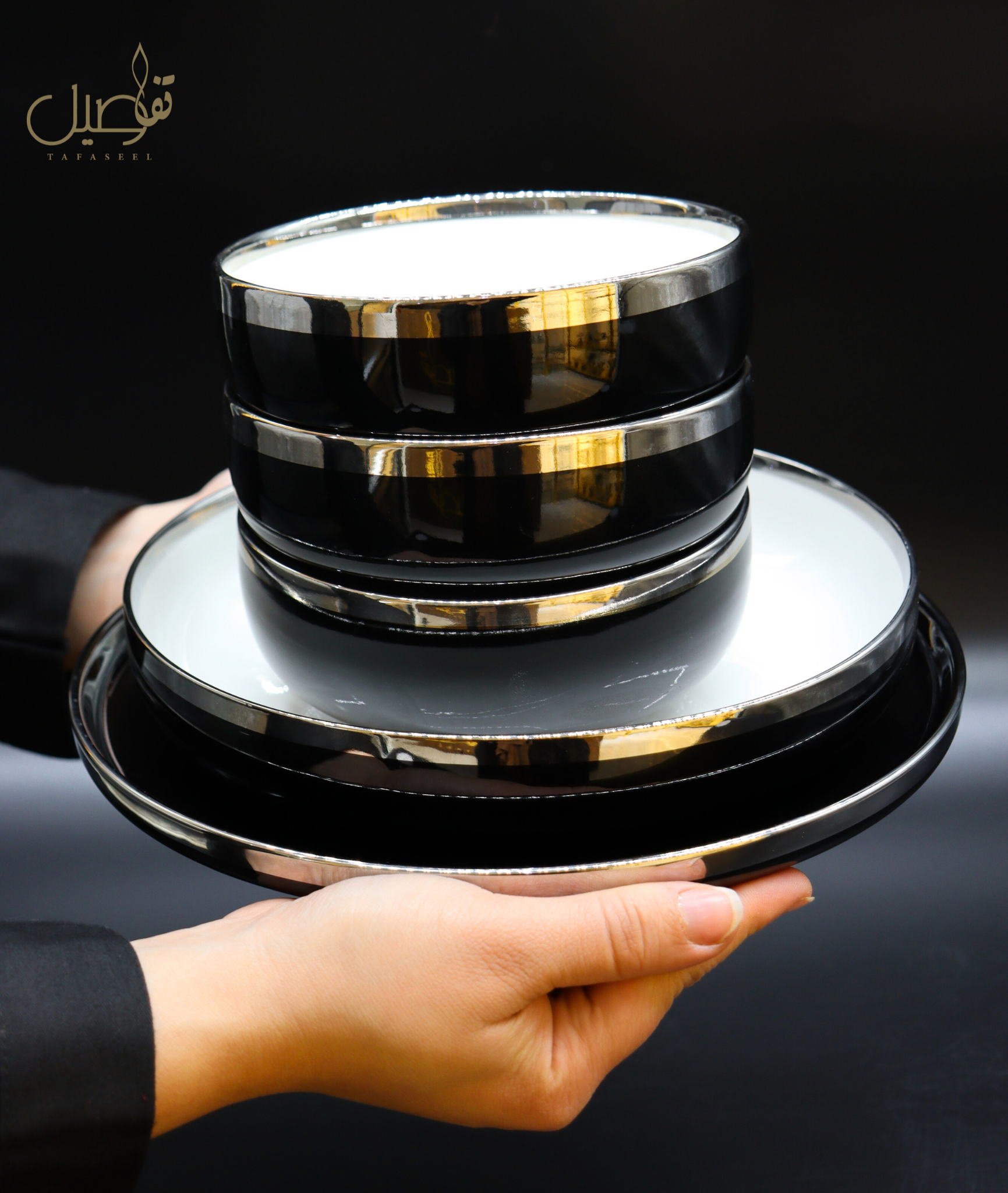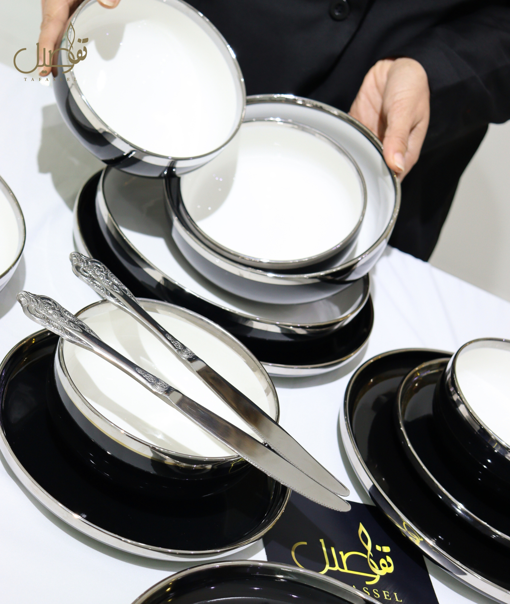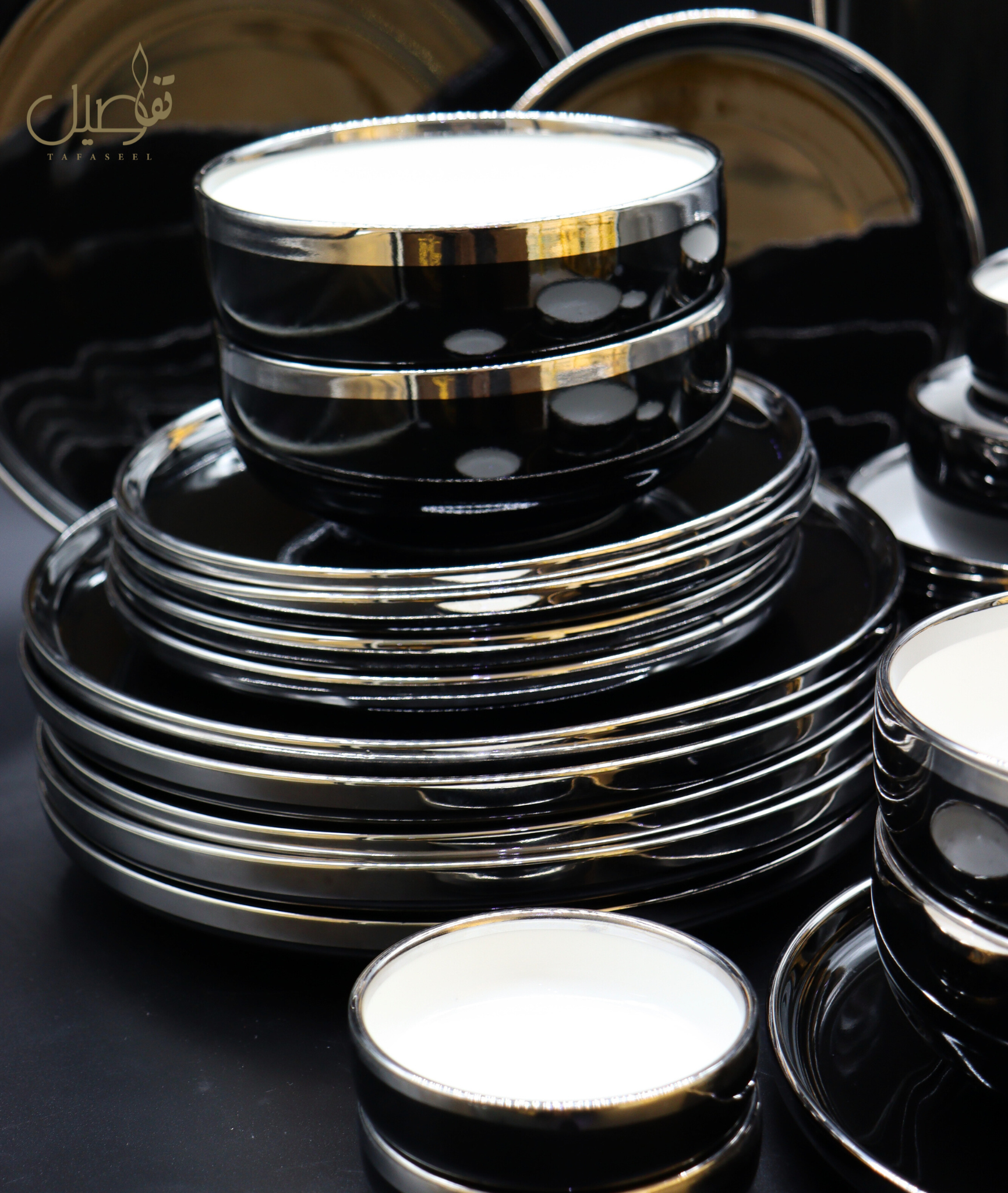 نقدّم لك طقمًا فاخرًا باللون الأسود الفضي الساحر، مكونًا من 27 قطعة مميزة، مصمم ليلائم كل المناسبات، سواء كنت تبحث عن إطلالة أنيقة في السهرات أو تود إضافة لمسة من الفخامة إلى يومك العادي.