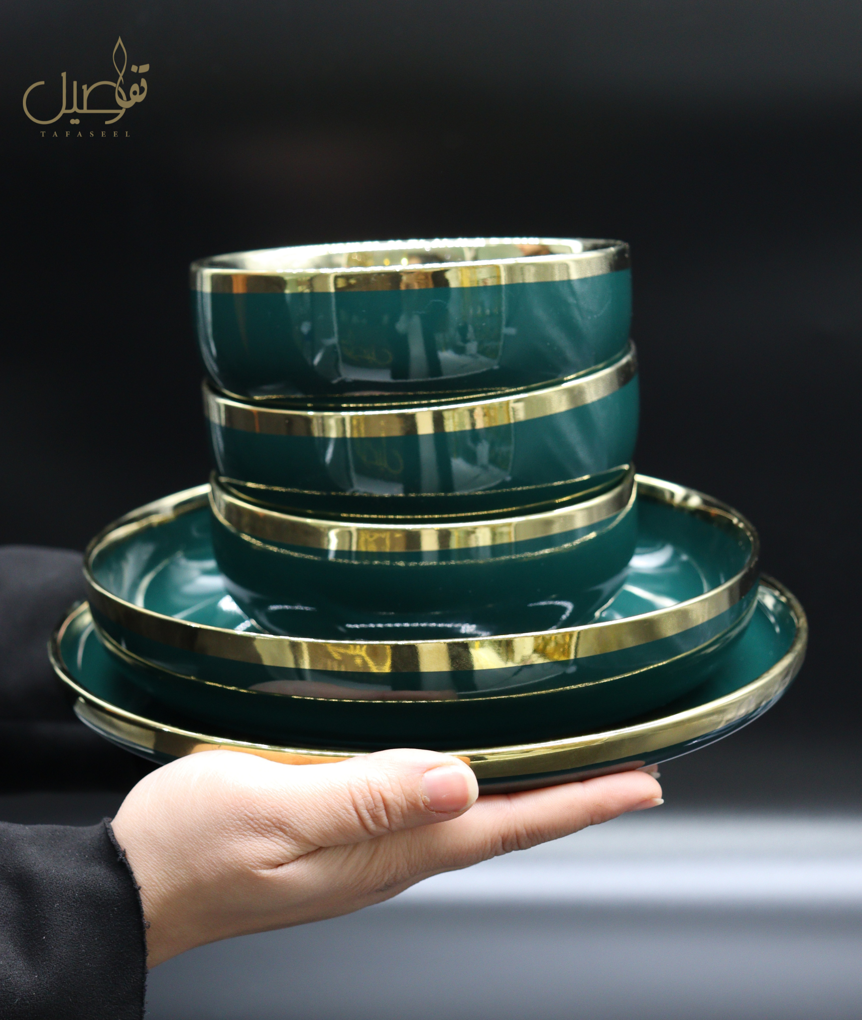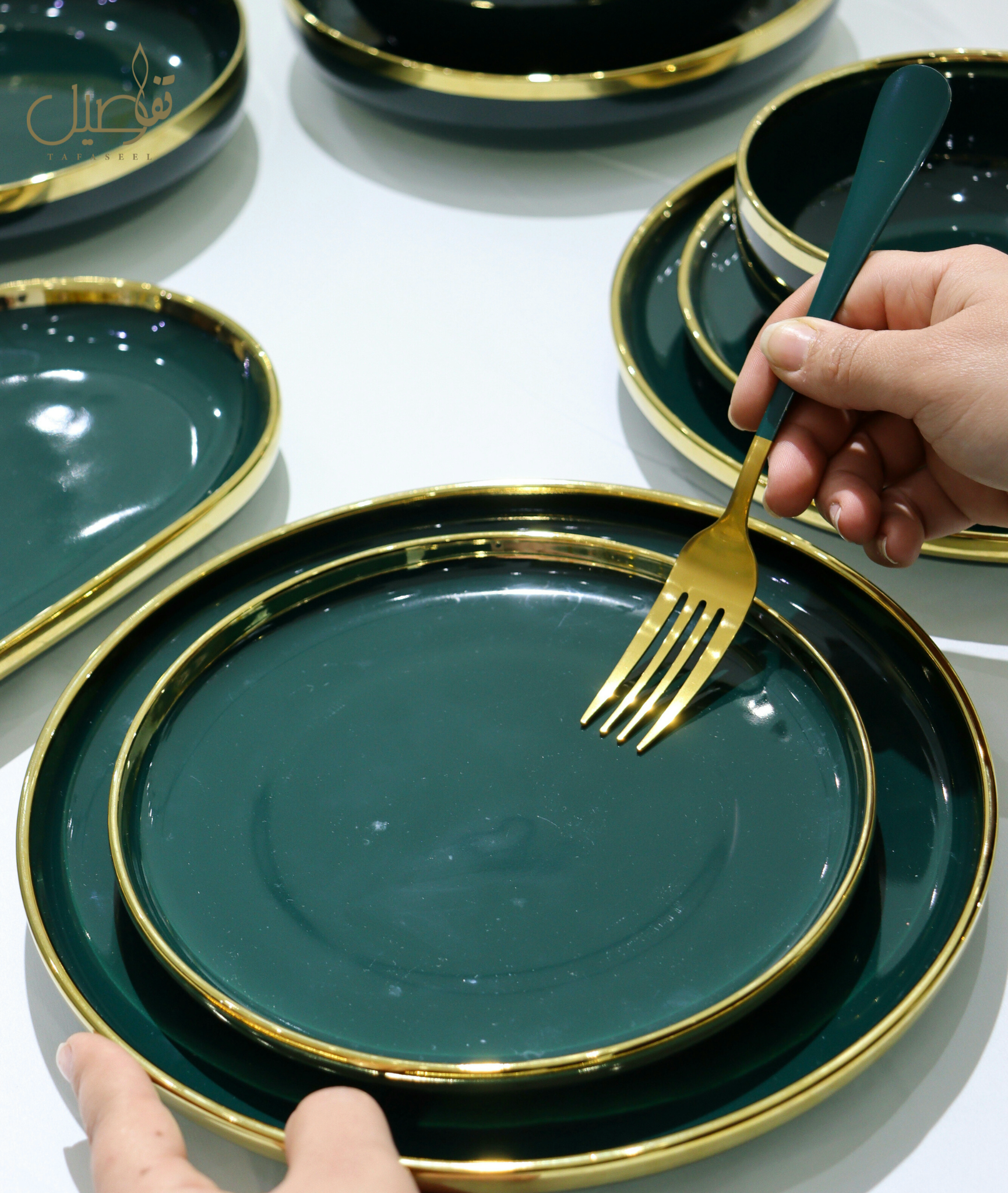 ✨ "لأناقة مائدتك... طقمك الأخضر بلمسة الذهب جاهز للإبهار!" ✨